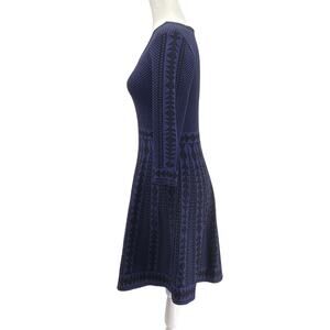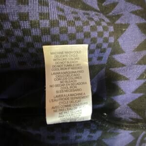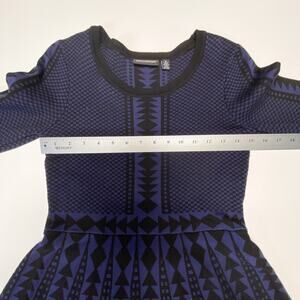 Make a statement with this Nina Leonard sweater dress in size medium, featuring a bold black and blue geometric print. Designed with 3/4 sleeves, a scoop neckline, and a flattering fit-and-flare silhouette, this dress is both stylish and comfortable. Made from a soft, stretchy rayon-blend knit, it provides a perfect balance of warmth and breathability, making it ideal for any season.