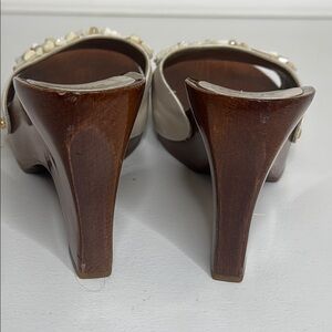 Elevate your style with these Vintage Y2K Stuart Weitzman sandals. Featuring a chic cream color and elegant shell and bead embellishments on the vamp, wood soles these shoes are perfect for anything to do with summer fun, 3.5 inch squared heel. Pre-owned in excellent condition. I cannot find a size so I measured the footbed staying with the curve and it measures 9 3/4 inches, see the last photo. Made in Spain.