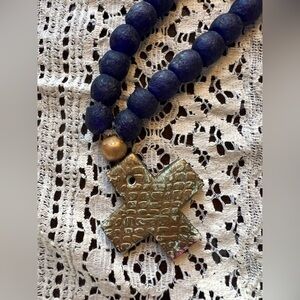 Handmade Ghana African Recycled Sea Glass Beads Necklace Cross Navy Blue