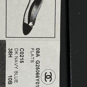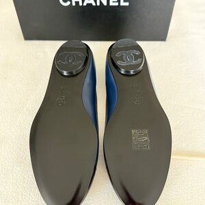 NEVER WORN. Black patent leather with navy blue accent. Double C logo on the toes.