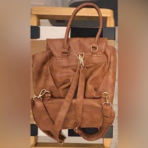 Beautiful Spacious Dark Tan backpack, perfect condition, barely used. Beautiful inside interior. Gold accents give the bag a nice high end look. Extra compartments on bag give you plenty of space to store everything you need on the go. Top of bag closure opens to a small pouch/ bag for an extra space to store stuff. From a smoke free home. Dimensions are H 14.5 x W 14 x D 5.5