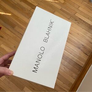 These elegant black heels by Manolo Blahnik feature a sophisticated pointed toe and a unique kitten heel design. The smooth material and V-shaped cut-out upper add a touch of modern elegance, making them perfect for any stylish occasion.