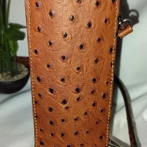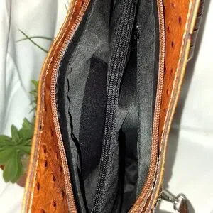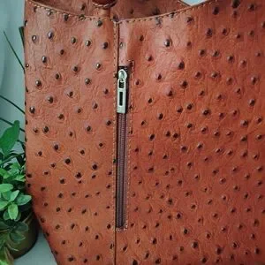Beautiful genuine leather in an ostrich print, convertible from backpack to shoulder bag. Features two outer zippered pockets with two large ones on the inside and one large zippered as well as two small ones.