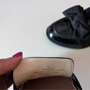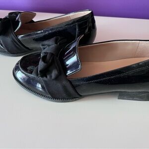 These Bandolino loafers feature a sleek black patent leather finish, complemented by a charming bow detail on the vamp. The classic loafer design ensures comfort with a flat sole, making them perfect for both casual and formal occasions.