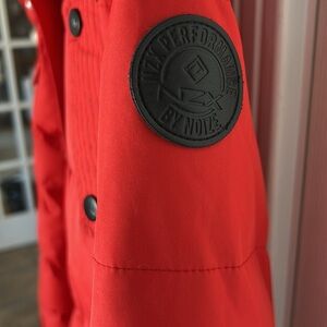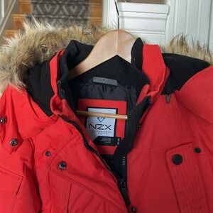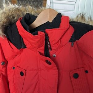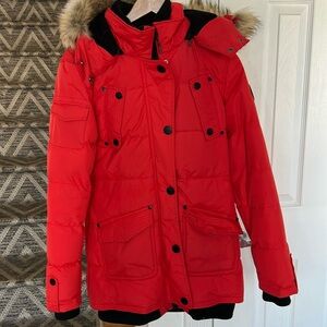 Noise winter jacket with removable fur on collar as well as detachable hood. I’m like new condition but has colour transfer from cross body bag that I have not tried to remove. Hidden under hood.