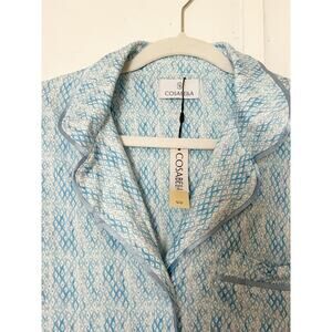 White and light blue snake print long sleeve lounge/night gown with button closures at top.
