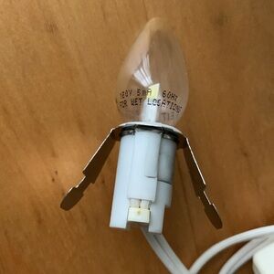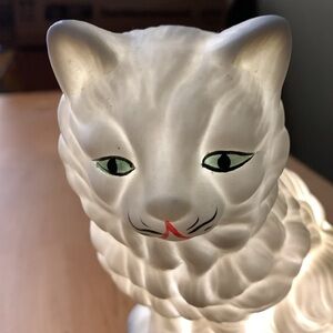 This little ceramic nightlight is the cat’s meow. She stands not quite 6” tall and at her widest (along the base of the lamp) measures about 4.25”. She has a built-in night light with a plug-in cord and a toggle to snap it on and off. The ceramic cat has a matte finish, with oodles of curly long hair (a Persian?), green eyes, a tiny red mouth and short little whiskers. I think she’s perfect as is, but if you wanted to paint different colors on her it could be an excellent and super fun project. Rare, retro, kitschy piece of cat art masquerading as a nightlight. Very 1950s little girl’s room.