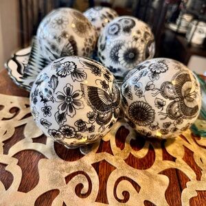 Beautiful ceramic toile pattern porcelain black and white chinoiserie 4” balls to use in your home decor and decorating.