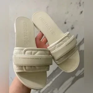 Step into luxury with these Dior cream slides. Perfect for casual outings, these slides offer both style and comfort.