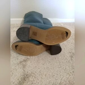 Beautiful and unique tall pull on leather teal boots. There is some slight scuffing shown in photos. No box included.