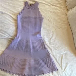 This stunning lavender mini knit dress features a ribbed texture and a flattering fit-and-flare silhouette. The sleeveless design and mock neck make it perfect for a cocktail night out, or wedding while the A-line cut adds a touch of elegance.
