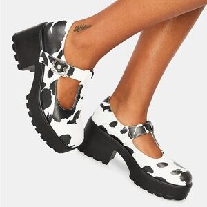 Size 5/38 Koi Footwear brand cow print Mary Jane’s sold on Dolls Kill. Worn once but too big for me. Fit like a solid 7 or 7 1/2.