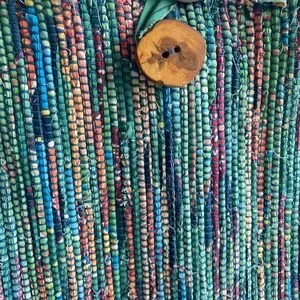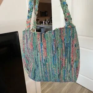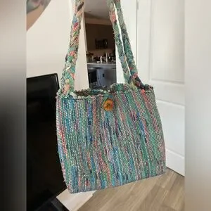 Small handwoven colored tote bag designed at The Weavery in Lexington KY with single wooden button. Never used, interior Velcro pocket separating pockets in tote. Great for a spring or vacation bag!