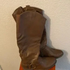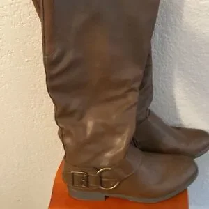 Unr8ed knee-high women’s boots brown zips on the side size 11 very good preowned condition super adorable brass buckle on the side embellishment