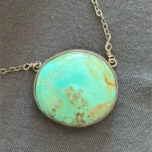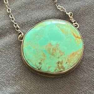 This necklace has a large Manassa turquoise cabochon in sterling silver, on a handcrafted chain. The stone's vibrant sea-green and blue hues with a golden-brown matrix add beauty. Pendant is about 2 inches, stamped '925', with an artisan clasp.