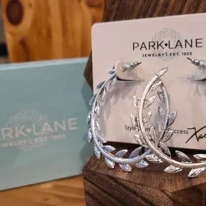 These Park Lane hoop earrings feature a stunning silver finish with a detailed leaf motif, offering a modern and organic touch to any ensemble.