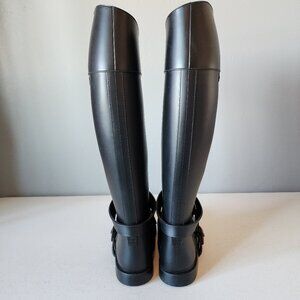 "LIKE NEW" Phenomenal Equestrian Style Rain/Rubber Boots By Givenchy. Pull on Style, Cushioned Foot Bed, Almond Toe, Lace Up Rubber Harness, Strap & Buckle Accent that's Removable for Different Look, Excellent Quality/ Durable Rubber, Made in Italy, 1" Rubber Heel with Rubber Grip Soles, 16.5" Tall from Arch w/High Low Look, 16" Circumference at Top, Like New Condition, Never Worn Only Tried On, Minor Markings Normal Retail Environment:) Rt.495.00 approx. Size 40 / 9, Foot Bed Measures 10.1/4" for Reference. * Perfect Rainy Day/Riding/Shopping Boot!