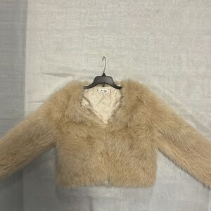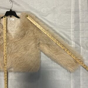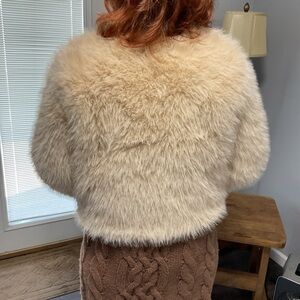 NWOT Dusky Beige Highlights Creamy White Fox Fur Cropped Jacket, Long Sleeve High Waist Faux Fur Women’s Winter Jacket Open Front Cardigan Or Closure 2 Fur Hooks