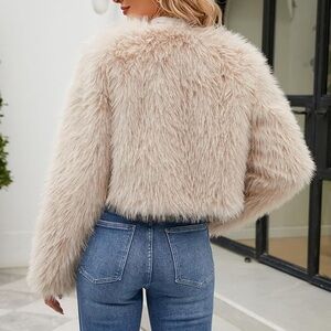 NEW!! Dusky Beige Highlights Creamy White Faux Fox Fur Cropped Long Sleeve Women’s Winter Coat, High Waist Faux Fur Women’s Winter Jacket Open Front Cardigan Or Closure 2 Fur Hooks
