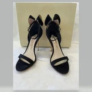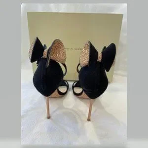 Black velvet, pink glitter, bow, open toe, ankle strap, rose gold color high heels.