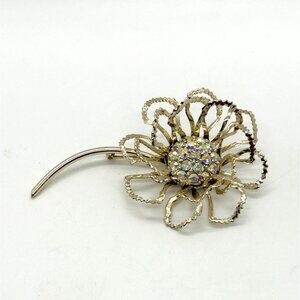 This Sarah Coventry brooch showcases a delicate flower design embellished with shimmering aurora borealis rhinestones, adding timeless elegance to any outfit or accessory.