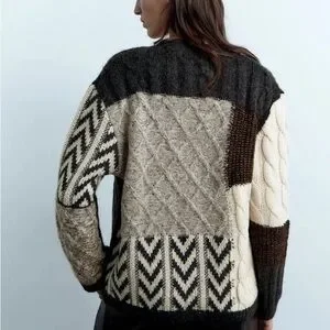 New ZARA Patchwork Cable Knit Cardigan Neutral Chevron Size S