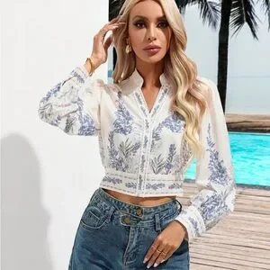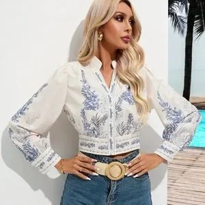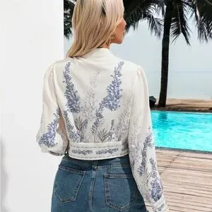 This cream blouse features a chic crop style with a notched collar, offering a modern and elegant look. The embellished design adds a touch of sophistication, making it a versatile piece for various occasions. Its lightweight fabric ensures comfort and style throughout the day.