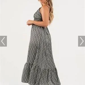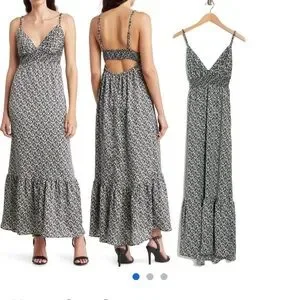 Ditsy florals pattern this charming satin dress designed with an open back and of-the-moment tiered maxi length skirt. Pink satin