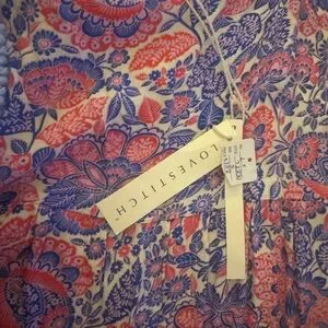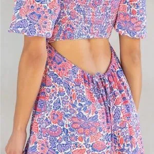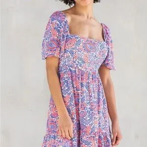 This charming sundress by Lovestitch features a smocked bodice and a flowing pleated skirt, perfect for casual or resort wear. The square neckline and short puff sleeves add a touch of elegance, while the pink and blue hues create a vibrant look.