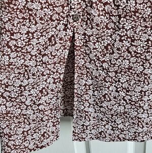 Rusty floral dress with buttons all the way down the front, butterfly sleeves, slit at the bottom, and comes with a matching waist tie.