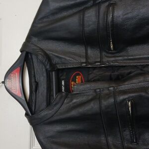 This Hot Leathers jacket combines a sleek black design with a vintage appeal, perfect for adding a touch of classic style to your wardrobe. Its structured seams and collarless design offer a modern twist, making it an ideal choice for casual outings.