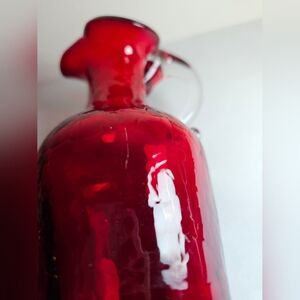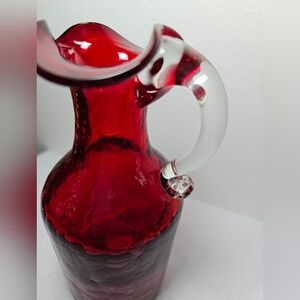 VTG Red Crackle Glass Vase Pitcher Blown Glass, Applied Handle 5"