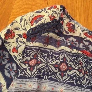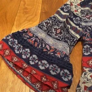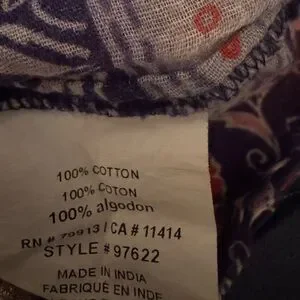 The 100% cotton top is in excellent like new condition with beautiful crocheted lace detailing and lovely pintucking over the chest. Also the ties end in tassels. This flattering blousewill grow with baby and will be wonderful postpartum as well. It also has beautiful bell sleeve which gives lot of beautiful movement. This one will flatter and fit your shape the entire pregnancy and into postpartum. It is breezy and beautiful.