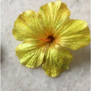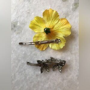 Beautiful Spring Pair of two, including: pretty pink butterfly crystal hair barrette in dark silver tone filigree style with pink, and clear ab crystals, and a beautiful yellow glitter flower hairclip handcrafted new. In good condition, clips open nicely and crystals in tact silver tone base metal on clip barely visible tarnish overall good condition, beautiful for spring summer pop of color crystal and sparkles ✨🌞🌸🌺🌼
