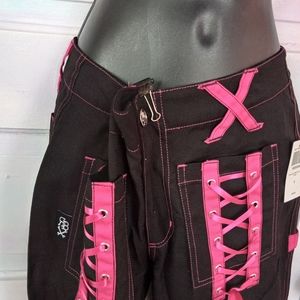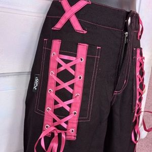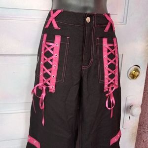 These super dope royal bones pants are nwt. wide leg with pink ribbon corset lacing on thighs and other rad additions! coolest pants!!!