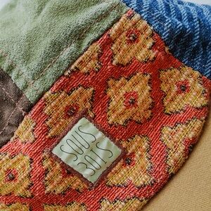 This handmade, one-of-a-kind 5-panel hat by Sous Bois is a true statement piece. Crafted from upcycled fabric scraps, it features a patchwork/colorblock design with earthy tones and unique patterns, ensuring that no two hats are ever the same.