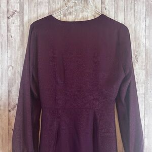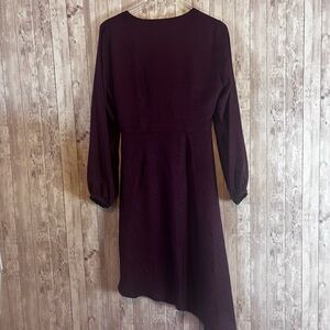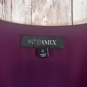 Women's size 8 Intermix 'Nadia' silk jacquard-print midi dress in dark purple. Surplice neckline, asymmetric hem, side zip, and faux wrap waist.