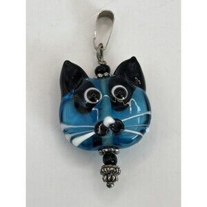 Glass Cat Face Pendant Blue, Black, And White 1”