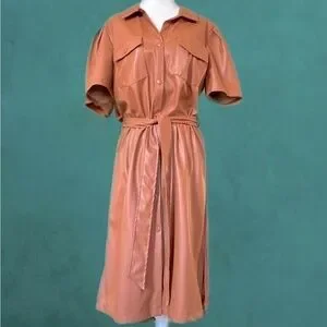 Shirt dress is made of vegan leather that is buttery soft and drapes beautifully. Roomy puffed sleeves, front pocket detail, snap buttons. Color is butterscotch. Size M.