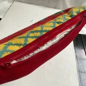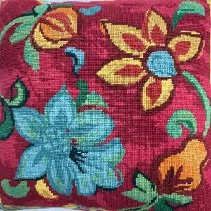 Vintage Needlepoint 15 Inch Pillow Retro Pink Red Black Flowers Velvet Colorful