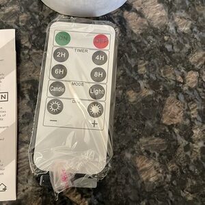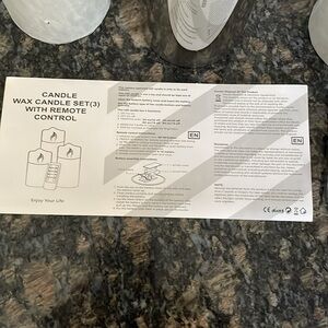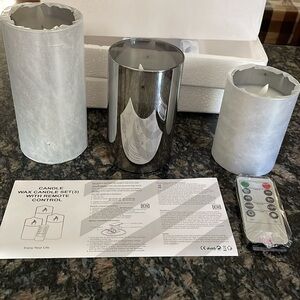 Elegant LED candle set featuring grey glass. Includes a convenient remote control for easy operation. New in box, never used. Large and small candle still wrapped in protective paper for shipping. Batteries not included. Sizes of candles range from 6 inches, 5 inches and 4 inches.
