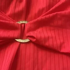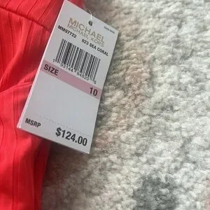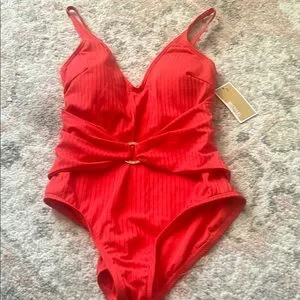 Orange/red ribbed one piece v neck swimsuit w removable padding and belt waist detail