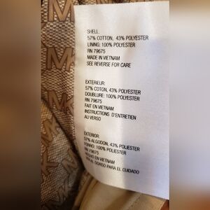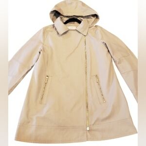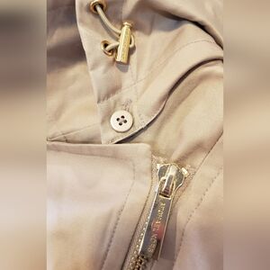 NWT Michael Kors british khaki short trench coat with detachable hood. Women's size Large. MK signature lining. Gold hardware. Front zipper closure. 2 front zipper pockets. 21in pit to pit. 28in length.