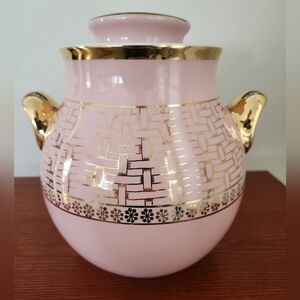This Hall pink and gold cookie jar with basketweave pattern is one in Hall's 1950s Gold Label Kitchenware Line.