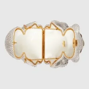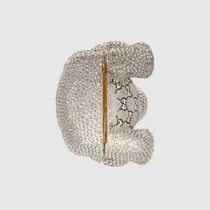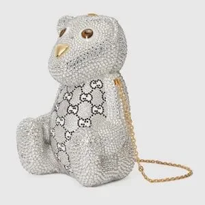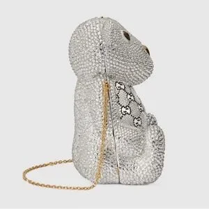 This Gucci Teddy bear shaped shoulder bag clutch is a luxurious accessory perfect for weddings, parties, or formal events. Made in Italy, it features a stunning silver exterior with silver hardware and a chain strap. The unique design adds a touch of whimsy to any outfit, making it a standout piece from the Gucci brand. With a retail price of over $28,000 USD, this bag is a statement piece that exudes elegance and sophistication.