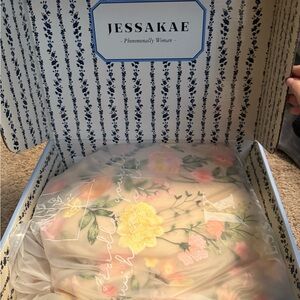 This stunning formal dress by JessaKae showcases a delicate yellow and cream palette, enhanced by a scoop neckline and flutter sleeves. Perfect for weddings or proms, its A-line silhouette offers a graceful flow, making it an elegant choice for any special occasion.