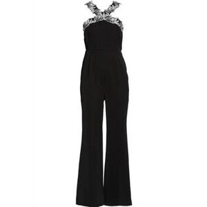 Cross your heart with flowers in this jumpsuit topped by a crisscrossed halter neck detailed in two-tone lace and cut with flared legs for a chic silhouette.