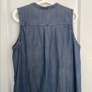 This elegant blue sundress by Eileen Fisher features a sleeveless design and a mandarin collar, perfect for casual or work settings. The buttoned style and midi length offer a chic and versatile look for any occasion.