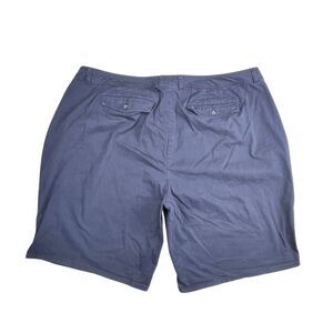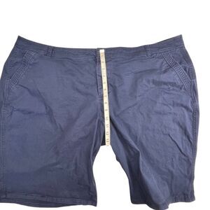 Lane Bryant Women's Navy Blue Chino Shorts in size 28W. These high-rise shorts feature a flat front with belt loops and slash pockets. Made of comfortable twill fabric with stretch, they are suitable for travel, casual outings, and workwear. The shorts are in a dark wash, ideal for summer, fall, and spring seasons. With an American, modern, and preppy theme, these Lane Bryant shorts offer a stylish and versatile option for various activities.