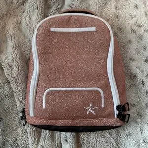 Good used condition. Rebel mini backpack makeup bag. Perfect for your all star cheerleader! Outside in pristine r condition with a rose gold glitter material. Inside minor makeup marks (see pics) holds your pallets and brushes!